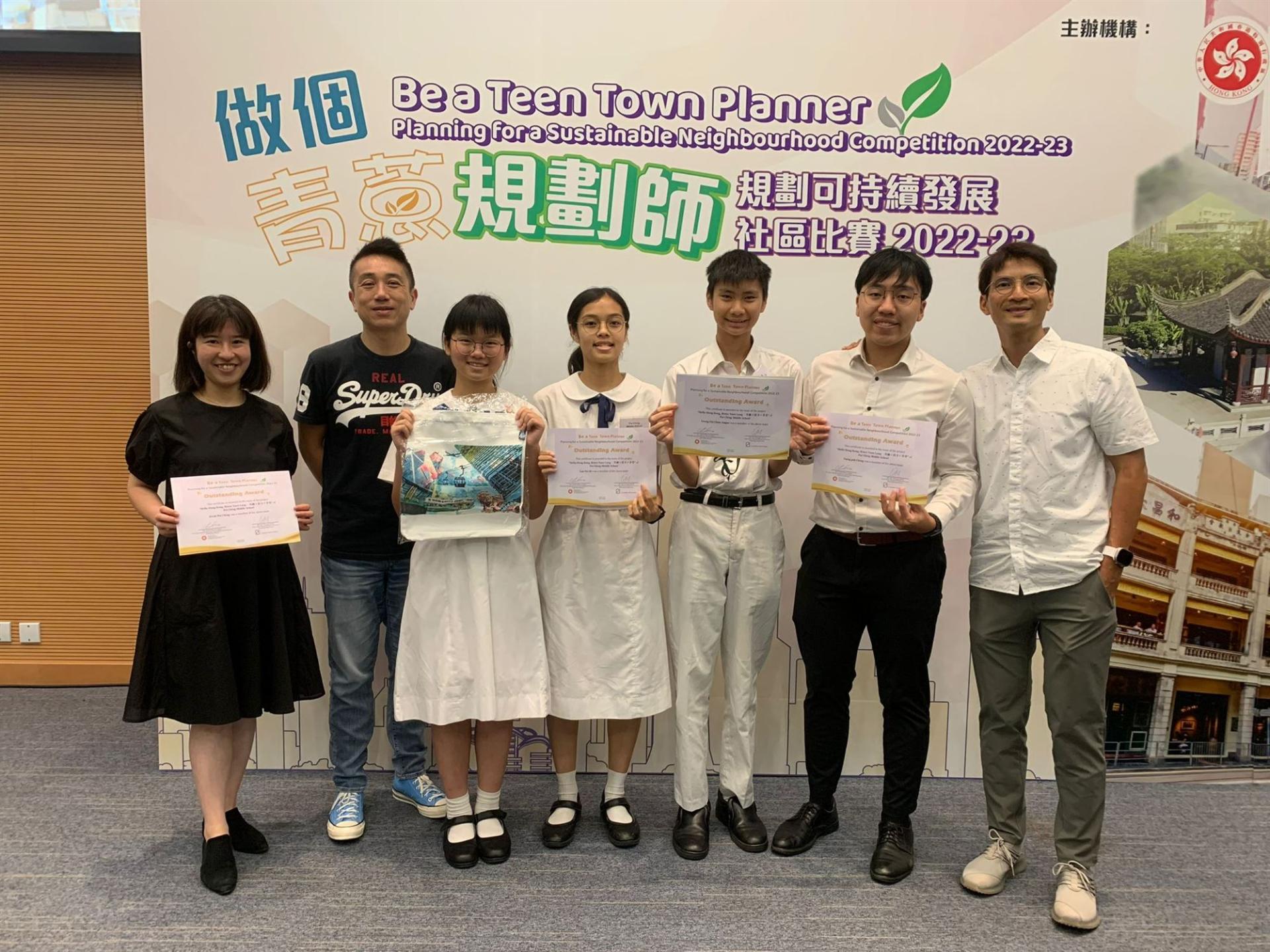 是次比賽由教育局及規劃署合辦,旨在讓學生透過解難,認識香港城市可持續發展。同學們經過多月蒐集資料、實地考察,以地圖製作軟件ArcGIS及手繪地圖為元朗擬訂了市區重建創意方案,勇奪傑出獎。