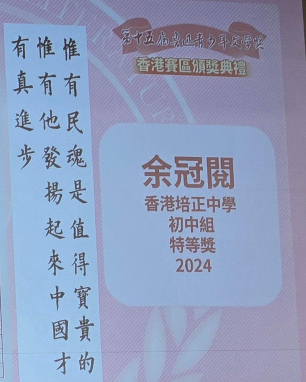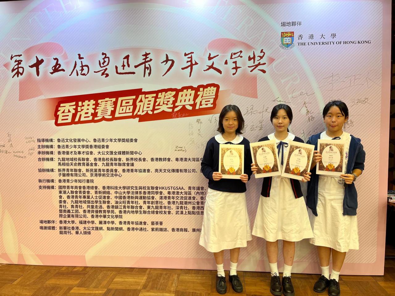 第十五屆魯迅青年文學獎圓滿結束,本校學生譚青悠同學獲得高中組中文寫作一等獎、蔡靖琦同學獲得初中組中文寫作優異獎、余冠閱同學獲得毛筆書法特等獎及硬筆書法三等獎。