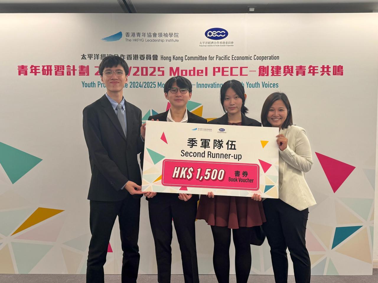 本校五望班李玥興同學、五正班曾柏程同學及王嘉進同學,參加「太平洋經濟合作香港委員會青年研習計劃2024/2025 Model PECC」,歷經二十四小時案例匯報及兩日一夜沉浸式體驗模擬太平洋經濟合作議會,勇奪季軍佳績!