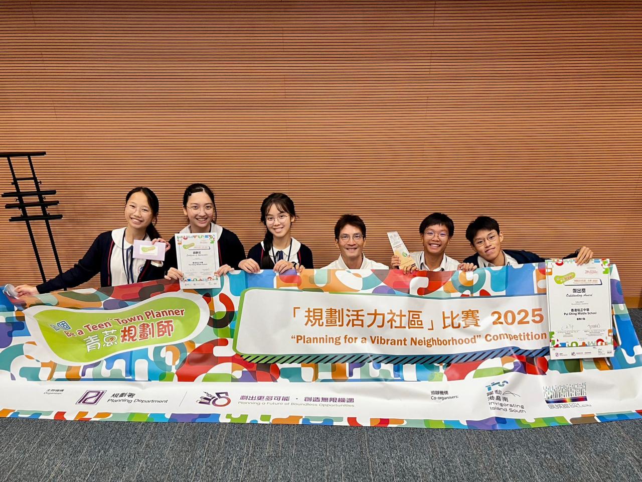 本校五位中三同學:三望班陳凱琳、三愛班彭博、陳柏丰、魏熙琳及吳梓君,參加「做個青葱規劃師:規劃活力社區」比賽2025,奪得傑出奬。
