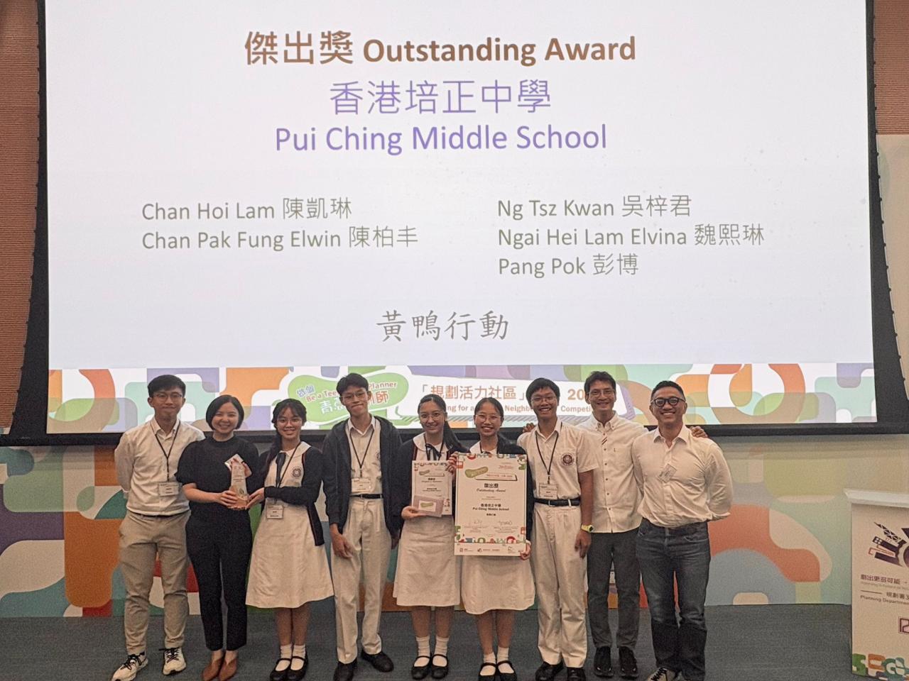 「做個青葱規劃師:規劃活力社區」比賽2025由規劃署、發展局躍動港島南辦事處及展城館舉辦,學生需在比賽中為黃竹坑、香港仔及鴨脷洲地區進行規劃研究,以「黃鴨行動」為主題,加入創新活化和傳統元素改造社區。在全港三十三份作品中,本校同學的方案脫穎而出,成為九強之一奪得傑出奬。
