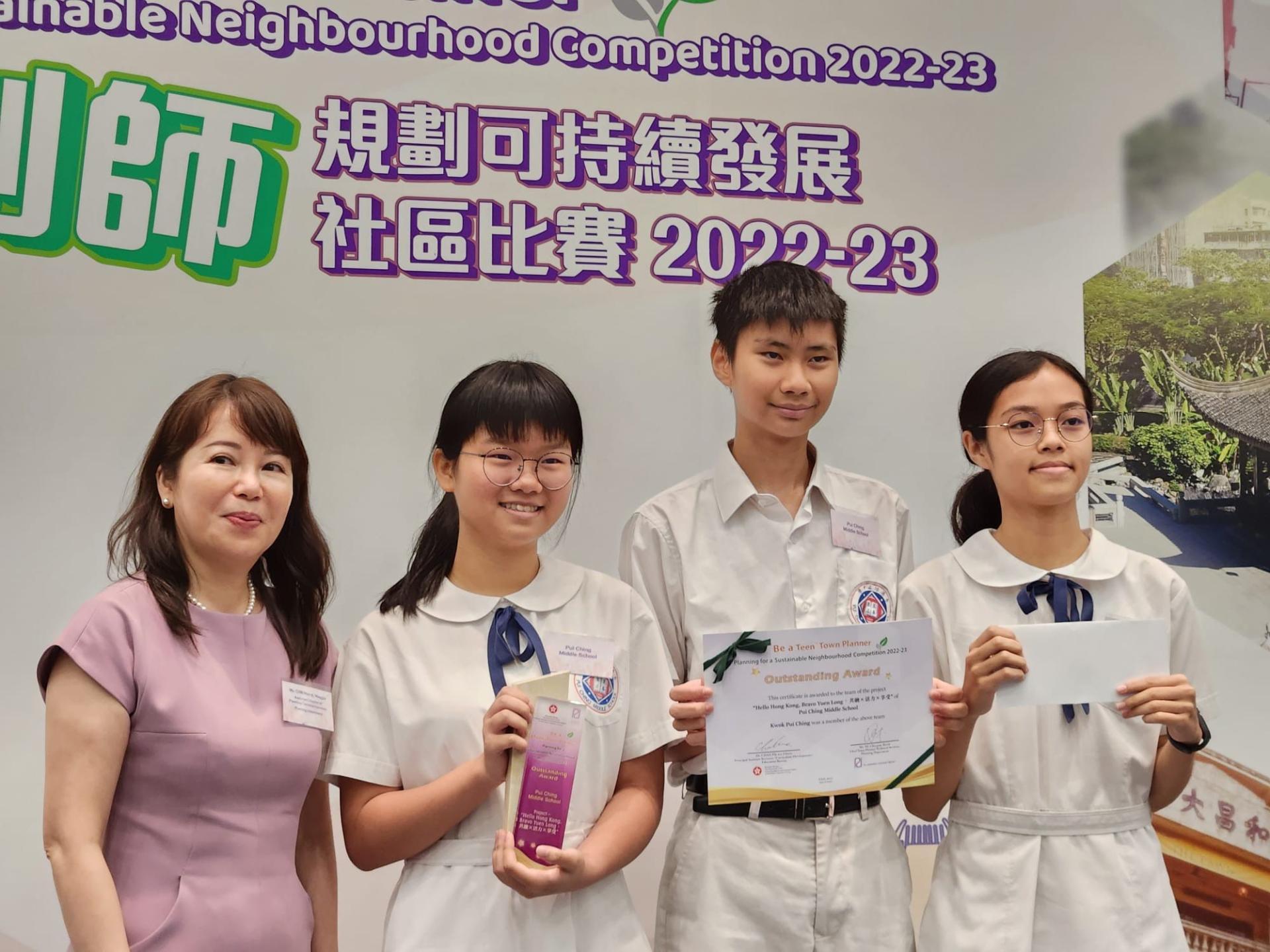 是次比賽由教育局及規劃署合辦,旨在讓學生透過解難,認識香港城市可持續發展。同學們經過多月蒐集資料、實地考察,以地圖製作軟件ArcGIS及手繪地圖為元朗擬訂了市區重建創意方案,勇奪傑出獎。