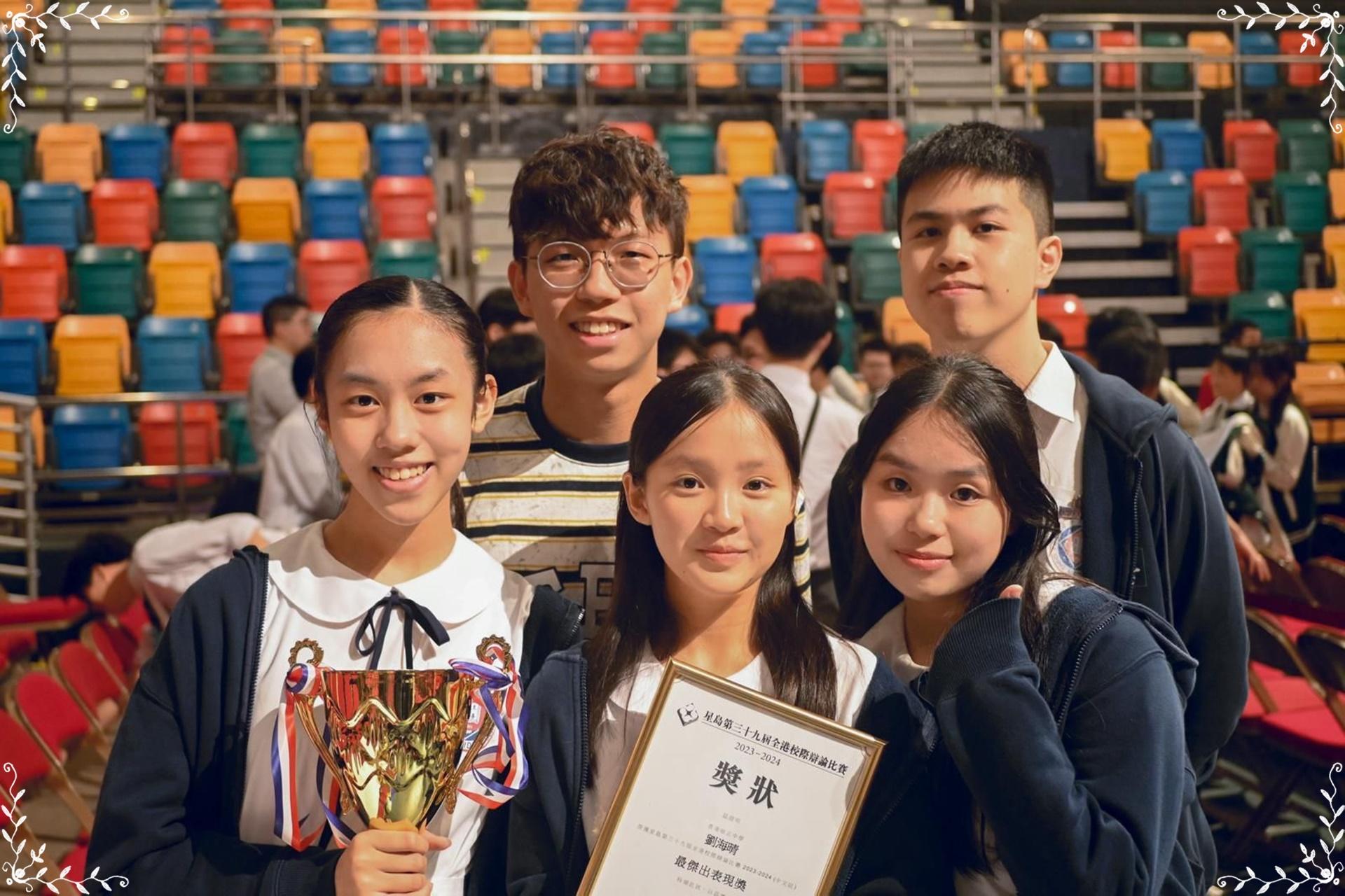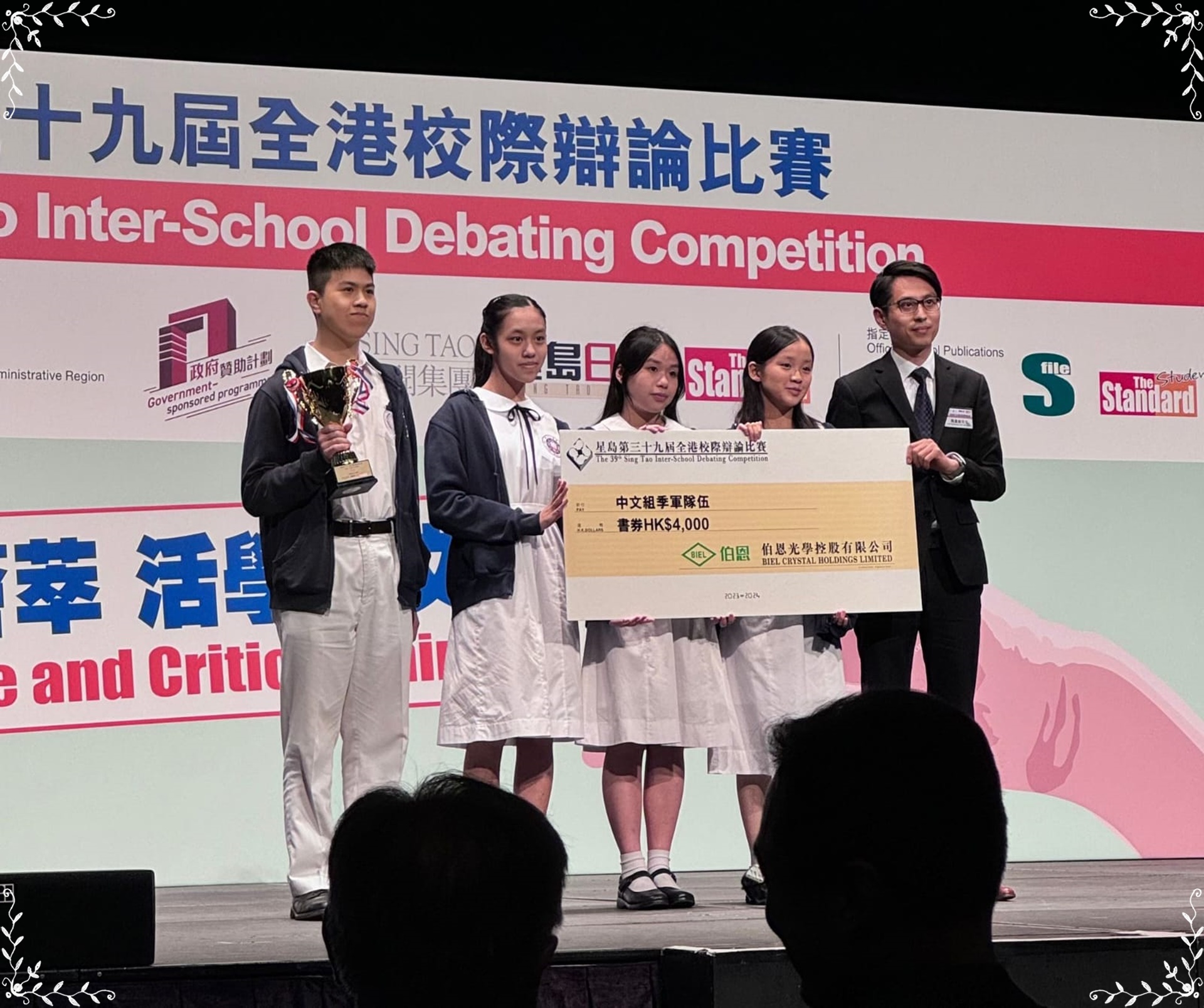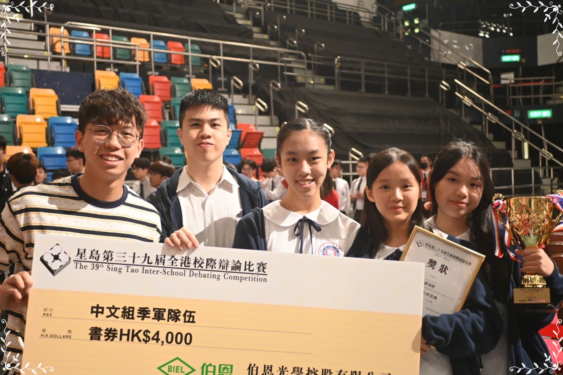 本校中文辯論隊榮獲星島第三十九屆全港校際辯論比賽中文組季軍!此外,五信班劉海晴同學更獲得中文組最傑出表現獎的殊榮,是各場比賽累積獲得「最佳辯論員」及「最佳交互答問辯論員」獎項數目最多的其中一位辯論員。