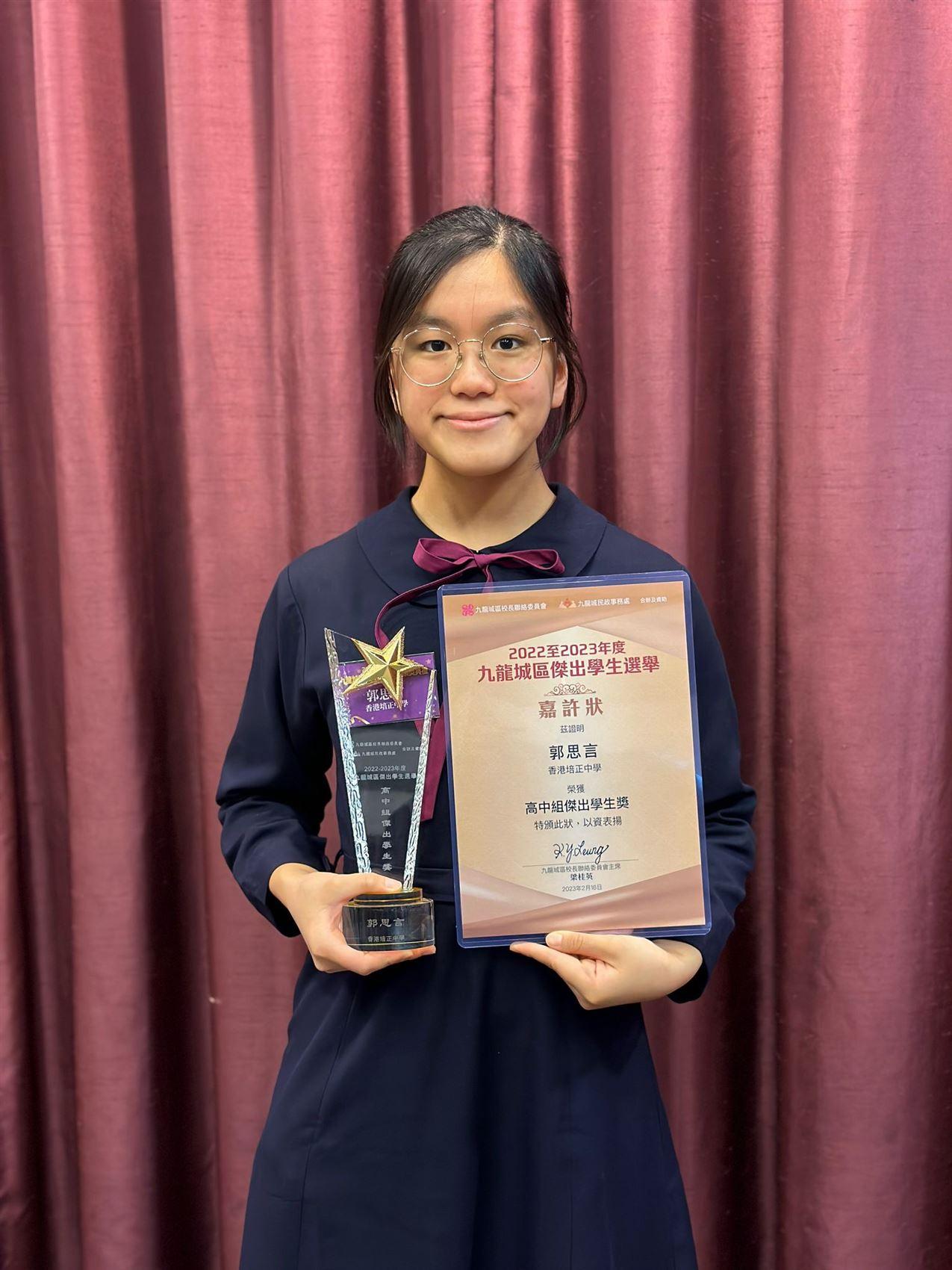 恭賀中五郭思言同學獲九龍城區高中組傑出學生獎,中三郭思妤同學獲初中組優異獎。