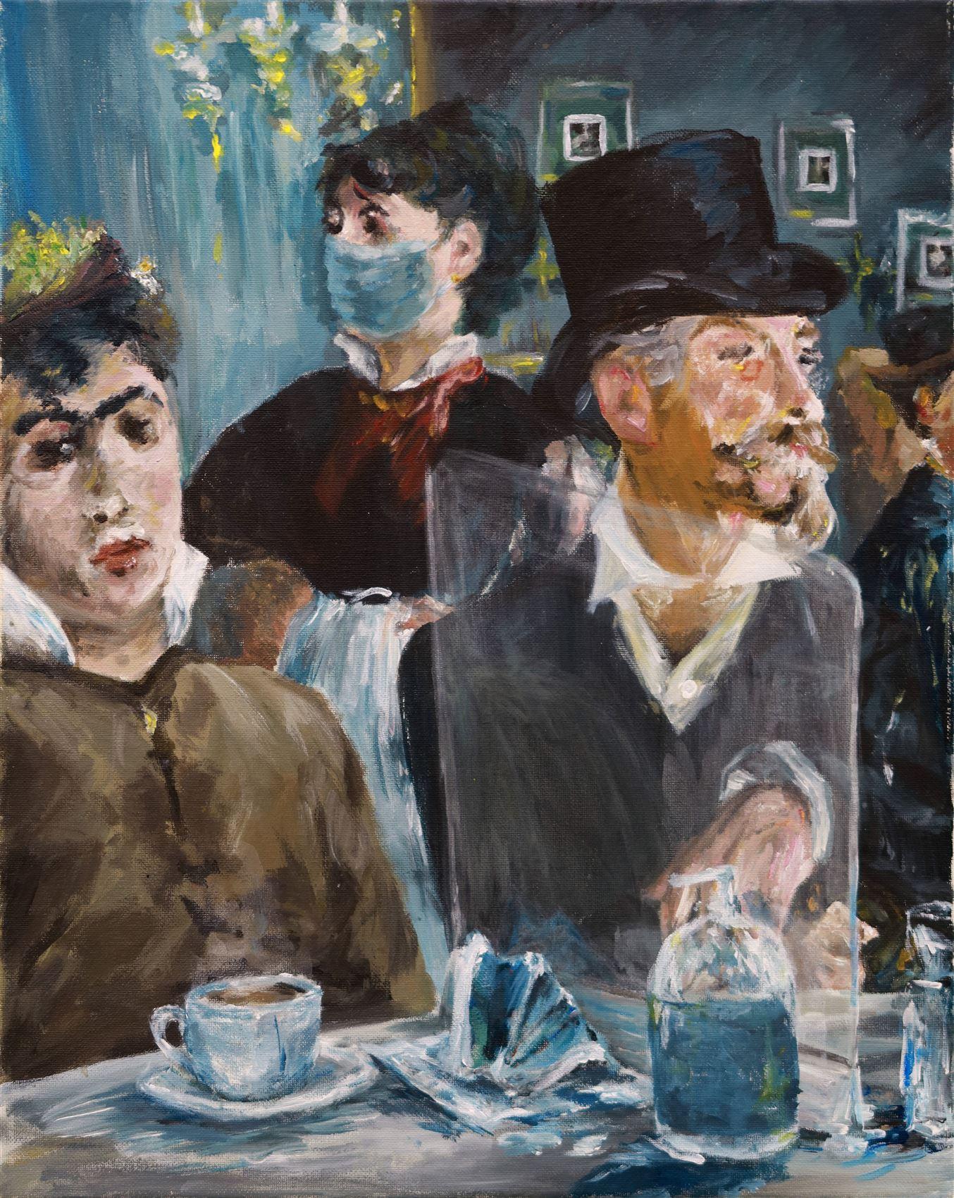 李芊忻同學的作品主题為《向藝術大師致敬致敬——在疫情下的咖啡廳 - 馬奈》,她將馬奈(Édouard Manet) 的作品《咖啡廳音樂會》(The Café-Concert)進行再創作,講述在2019冠狀病毒疫症大流行期間,日常生活深受影響,餐廳的運作,以至食客的改變很大——餐桌用隔板分開、牆壁貼上「安心出行」二維碼、食客會放口罩、消毒搓手液等防疫用品在桌上,形成前所未見的奇特景象,極具創意。