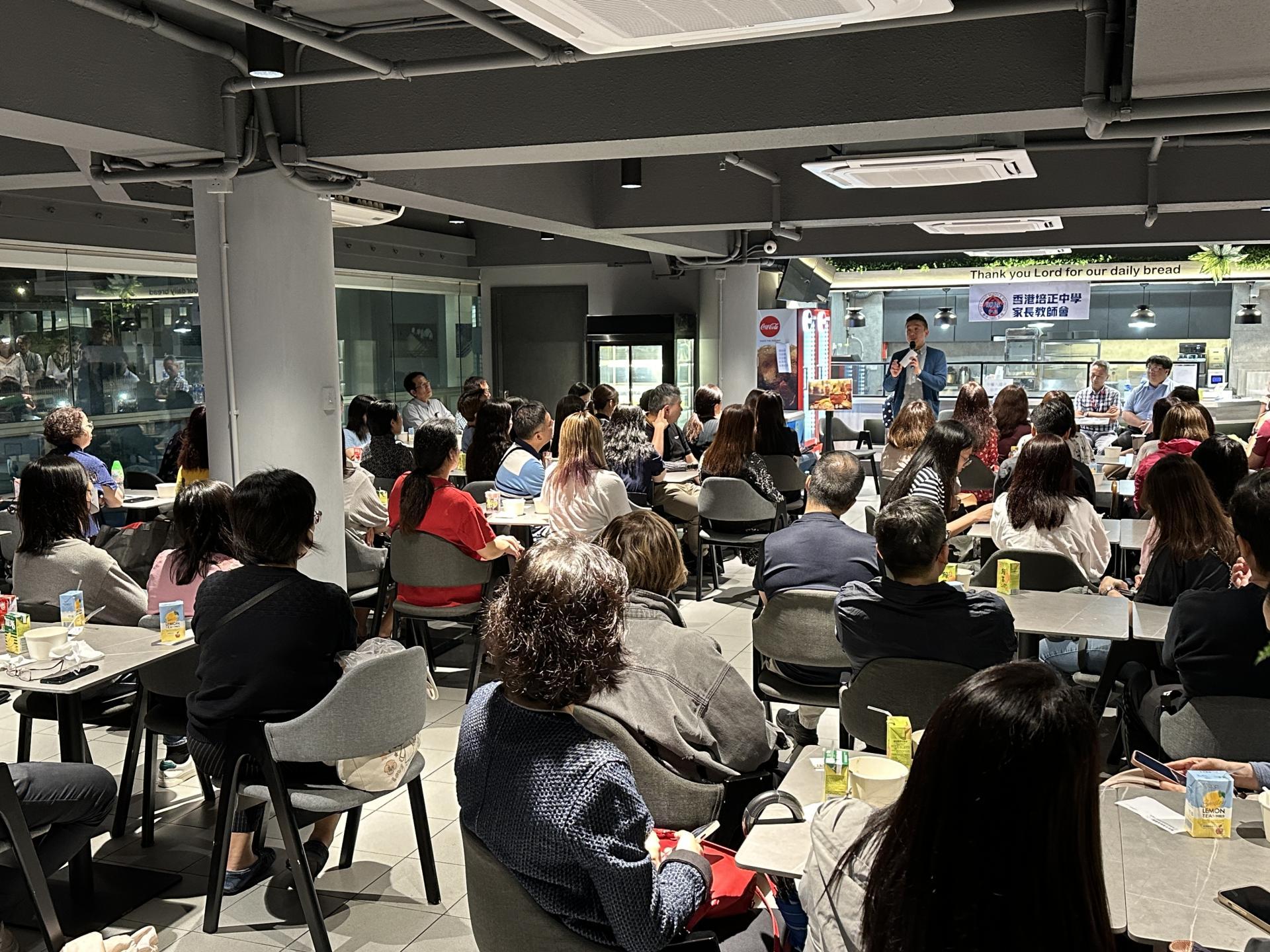 四月十九日晚上家教會主辦「與何校長茶聚」,約有八十多位家長出席。是晚何校長先呼籲家長支持135週年校慶活動,然後聯同副校長及助理校長回答家長問題。今年家長的問題各有不同,包括學生個人成長、學生學習困難、拔尖機會、小食部領餐安排以至內地升學,整體交流效果及氣氛良好。