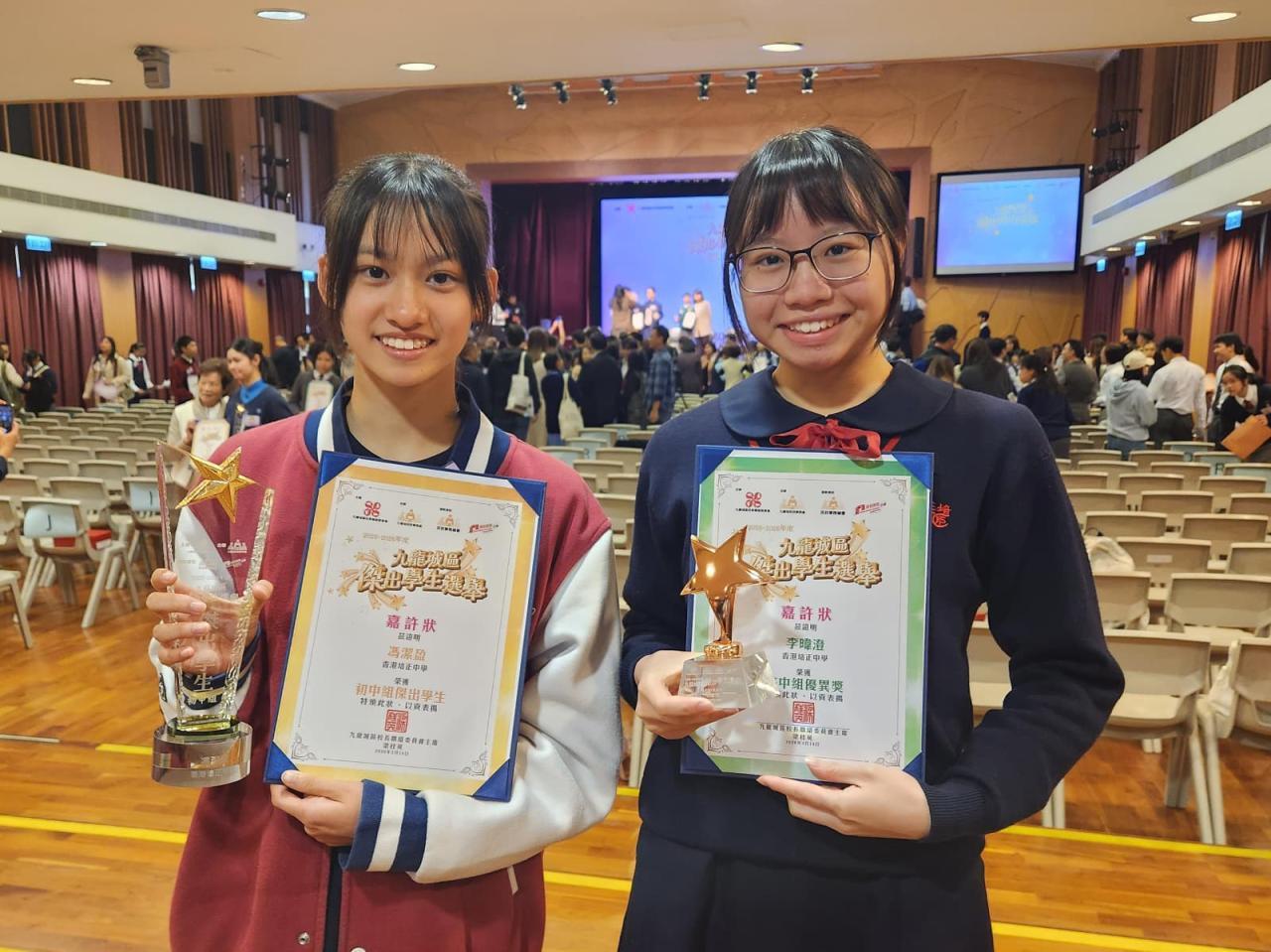 恭喜中三馮潔盈同學於2025至26年度九龍城區傑出學生選舉中獲得傑出學生獎(初中組),中五李暐澄同學獲得優異獎(高中組)。此選舉已有二十多年歷史,旨在表揚在品行、學業、課外活動及社會服務等方面有傑出表現的學生。